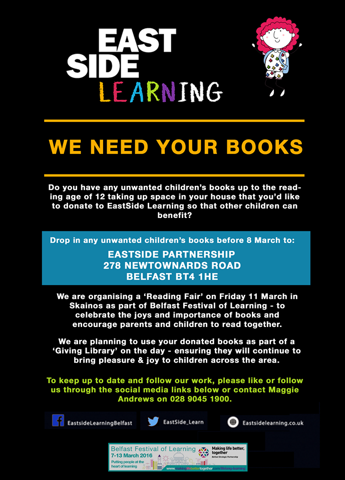 If you would like to donate some books please drop them in to EastSide Partnership offices by Tuesday 8th March.