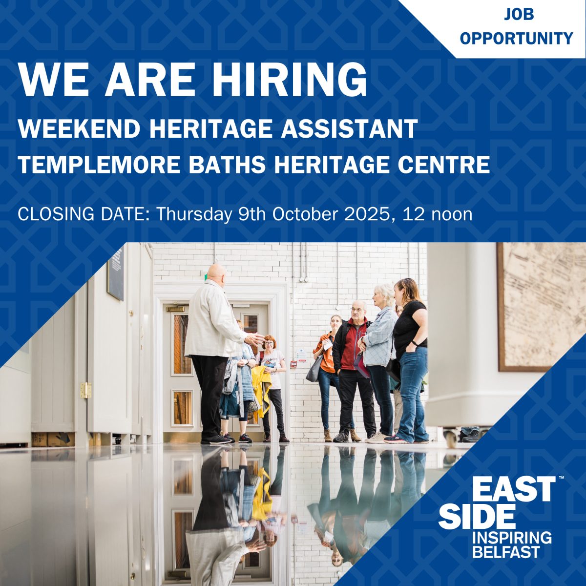 We are currently recruiting for the role of two Heritage Assistants at Templemore Baths, at weekends. This is an exciting role to support the Creative Programme Officer to animate the heritage space in Templemore Baths through a programme of tours, workshops and events that will engage the local community, schools and visitors.